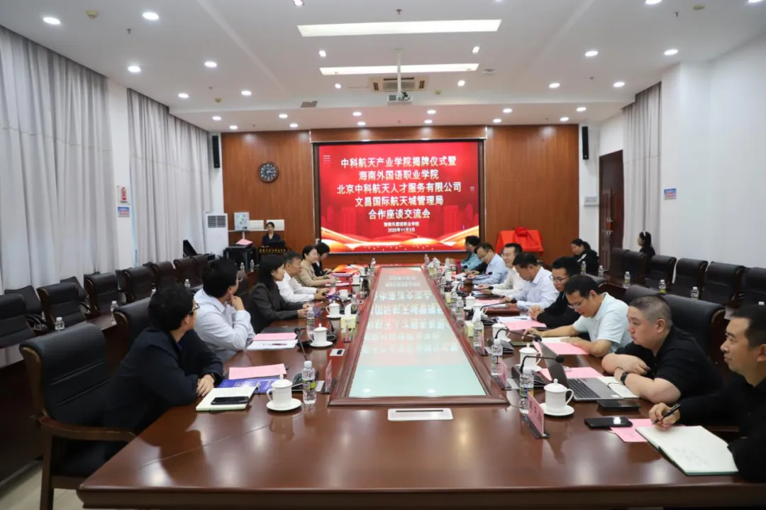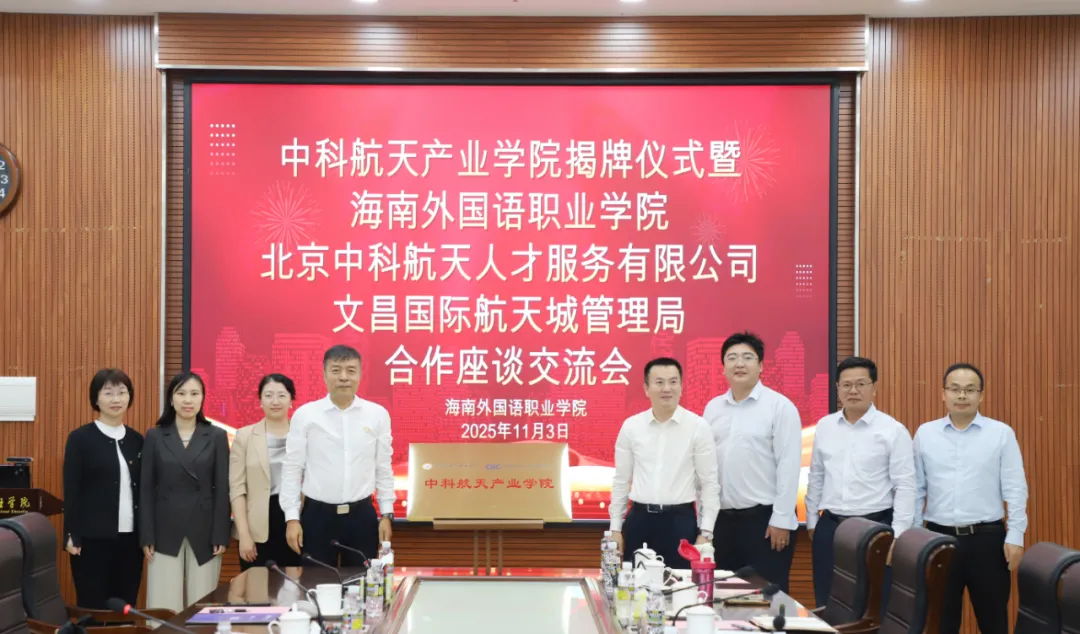 11月3日,中科航天产业学院揭牌仪式在海南省文昌市举行,同期还举办了海南外国语职业学院与北京中科航天人才服务有限公司、文昌国际航天城管理局的合作座谈交流会,标志着政校企深度融合、共育航天产业人才的合作模式迈出关键一步。