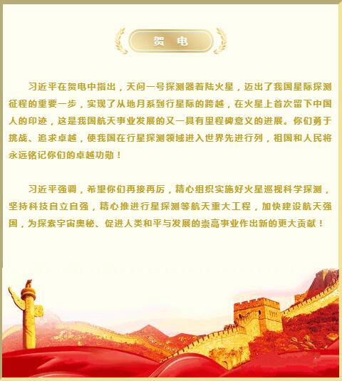 5月15日7时18分,由中国航天科技集团有限公司研制的天问一号探测器成功着陆于火星乌托邦平原南部预选着陆区,我国首次火星探测任务着陆火星取得成功。中共中央总书记、国家主席、中央军委主席习近平致贺电,代表党中央、国务院和中央军委,向首次火星探测任务指挥部并参加任务的全体同志致以热烈的祝贺和诚挚的问候。