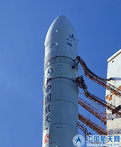 长征五号遥四运载火箭整流罩上印有天问一号任务有关合作组织或机构的logo(王磊 摄)